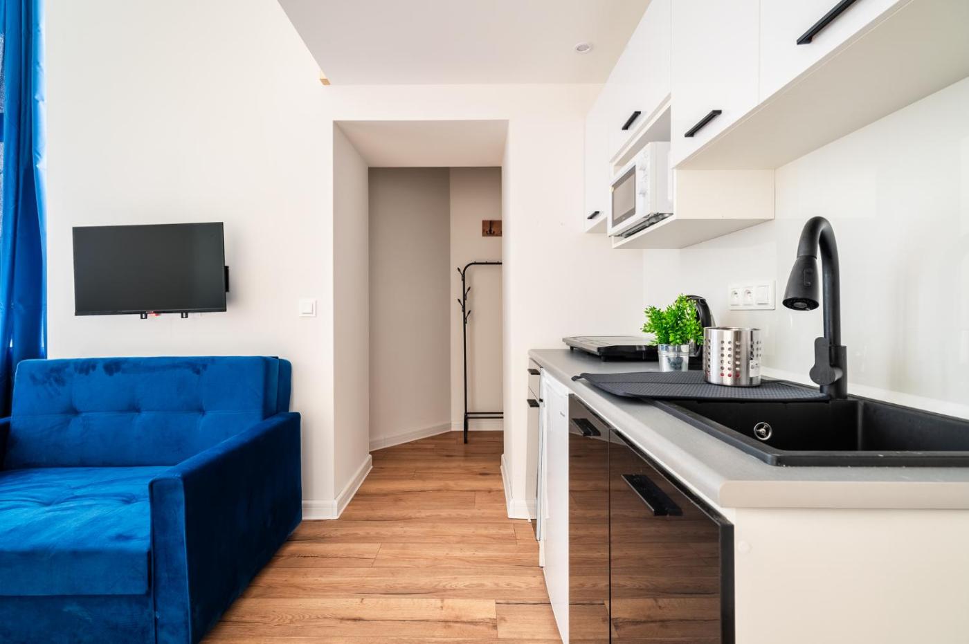 W apartamencie zapewniono sypialnię (1), aneks kuchenny z lodówką i mikrofalówką, a także łazienkę (1) z prysznicem, bezpłatnym zestawem kosmetyków oraz pralką. W apartamencie zapewniono ręczniki i pościel.